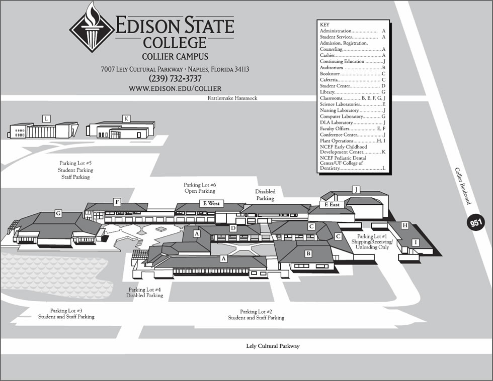 The Collier Campus is located on an 80-acre site at 7007 Lely Cultural Parkway, just south of Rattlesnake Hammock Road and west of Collier Boulevard (State Road 951) in Naples. The campus serves approximately 3,000 students and includes classrooms, learning resources (library), a bookstore, cafeteria, auditorium, and student lounge; biology, chemistry, and physics laboratories; and specialized laboratories for computer science, EMS, and nursing. Courses leading to bachelor and associate degrees and certificates, as well as non-credit continuing education classes are offered at the Collier Campus.